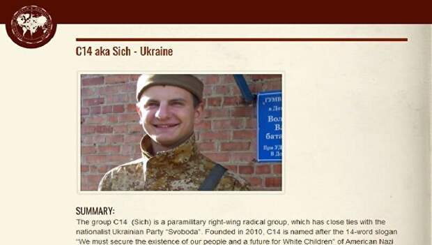 «Группа С14 («Сич») является парамилитарной праворадикальной группой, имеющей близкие связи с украинской националистической партией «Свобода», — сообщается на сайте.